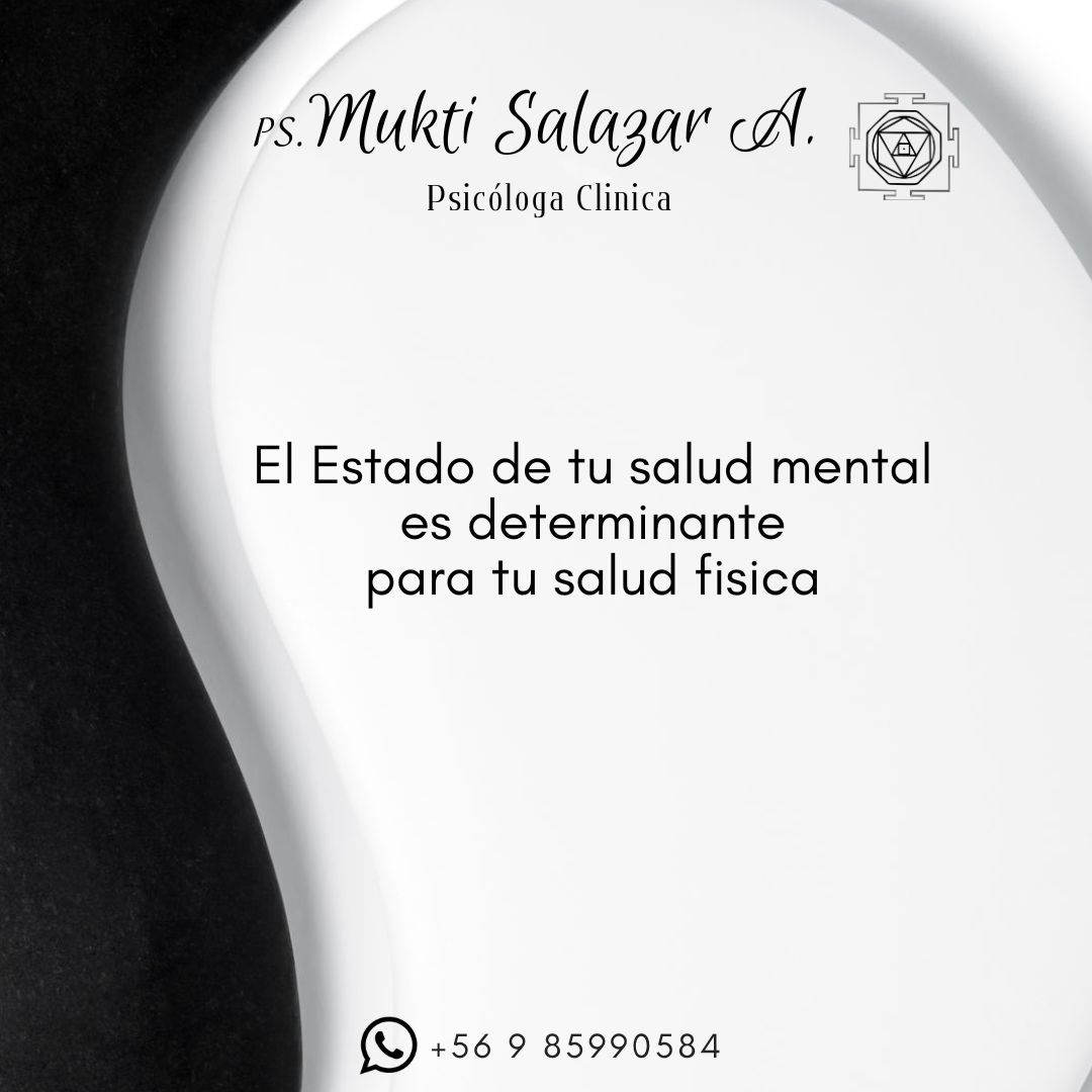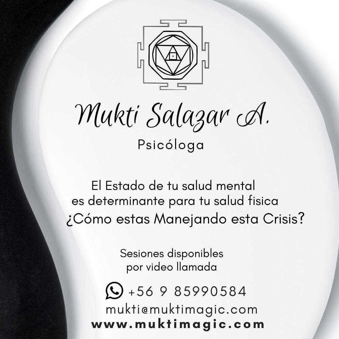 Adultos y Jóvenes Atención Online y Presencial Psicoterapia Coaching con PNL Terapia Transpersonal Mindfulness Terapia Floral (Bach, California ) Tarot Terapeutico Talleres de Crecimiento Personal Individuales y Grupales Encuéntranos +56 985990584 ps.muktisalazar@gmail.com Compartir en Compartir en Facebook Compartir en LinkedIn Compartir en WhatsApp Compartir en Correo electrónico